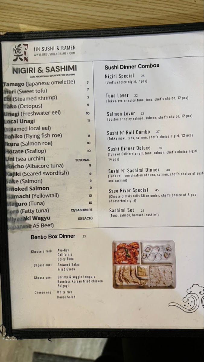 Build a bento box: choose 1 roll: avo-kyu, California, spicy tuna, spicy salmon. Choose 1 seaweed salad, fried dumplings. Choose 1 white rice, house salad.